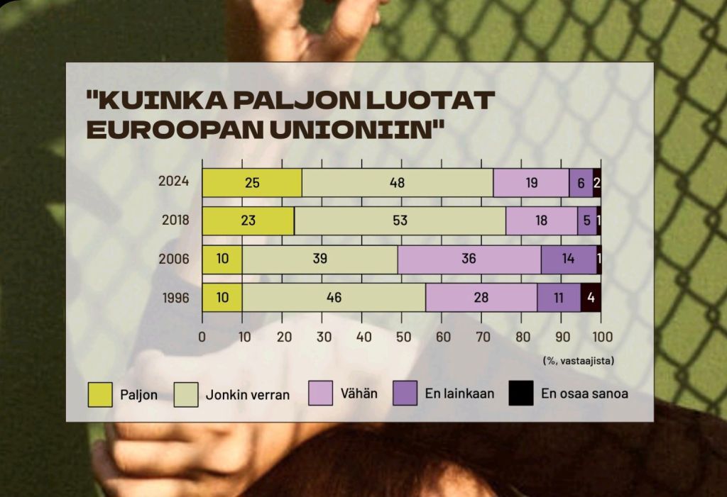 Det är glädjande att unga litar mer på EU. Det är, som bilden visar (finska), inte frågan om en tillfällig förändring, utan tilliten till EU har stabiliserats på en klart högre nivå än vid sekelskiftet.