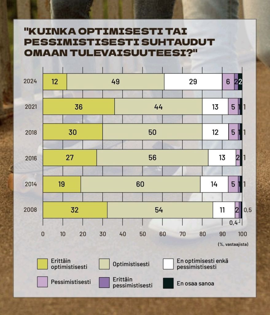 Andel unga som ser optimistisk på framtiden har gått ned ordentligt. Likaså andel unga som vill ha barn och familj i framtiden. I sig är det knappast konstigt att framtiden ser osäker ut. Det är mest pessimistiska nyheter och världsläget har inte heller blivit bättre sedan år 2024 då data samlats in, tvärt om.